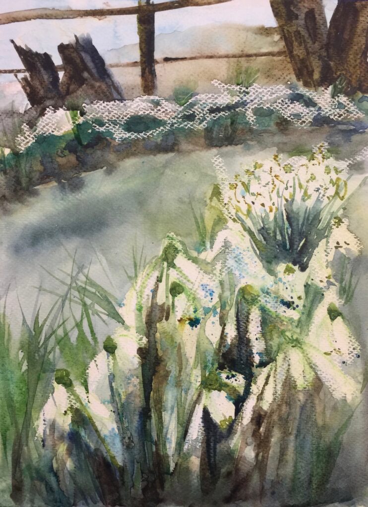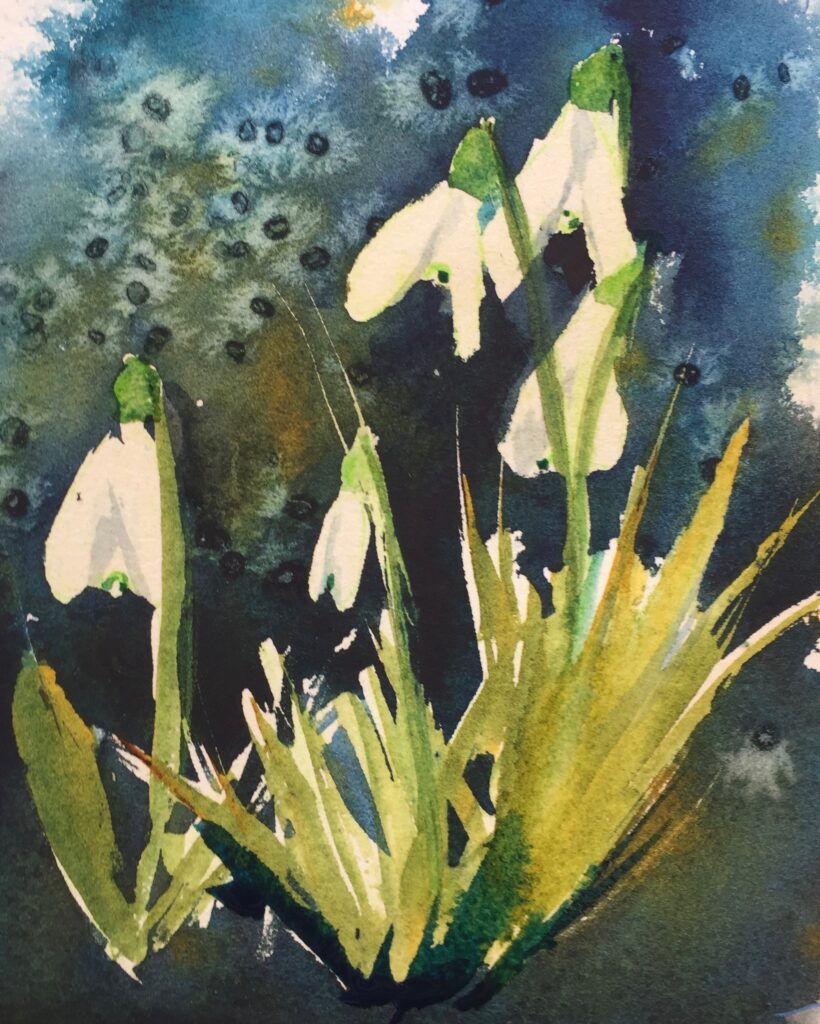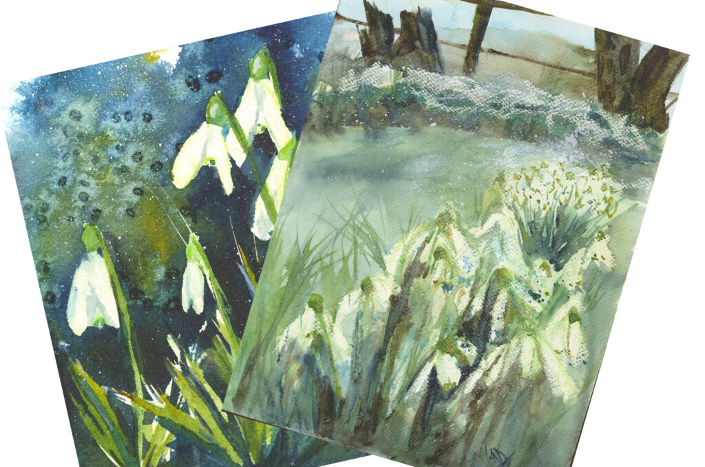 One of the delightful sights of the cold January days is delicate white blooms of snowdrops drifting across verges and through churchyards. No wonder we have the urge to pick up our paintbrushes when we see them. The fragility of these pristine white blossoms seems to be so well suited to watercolour.