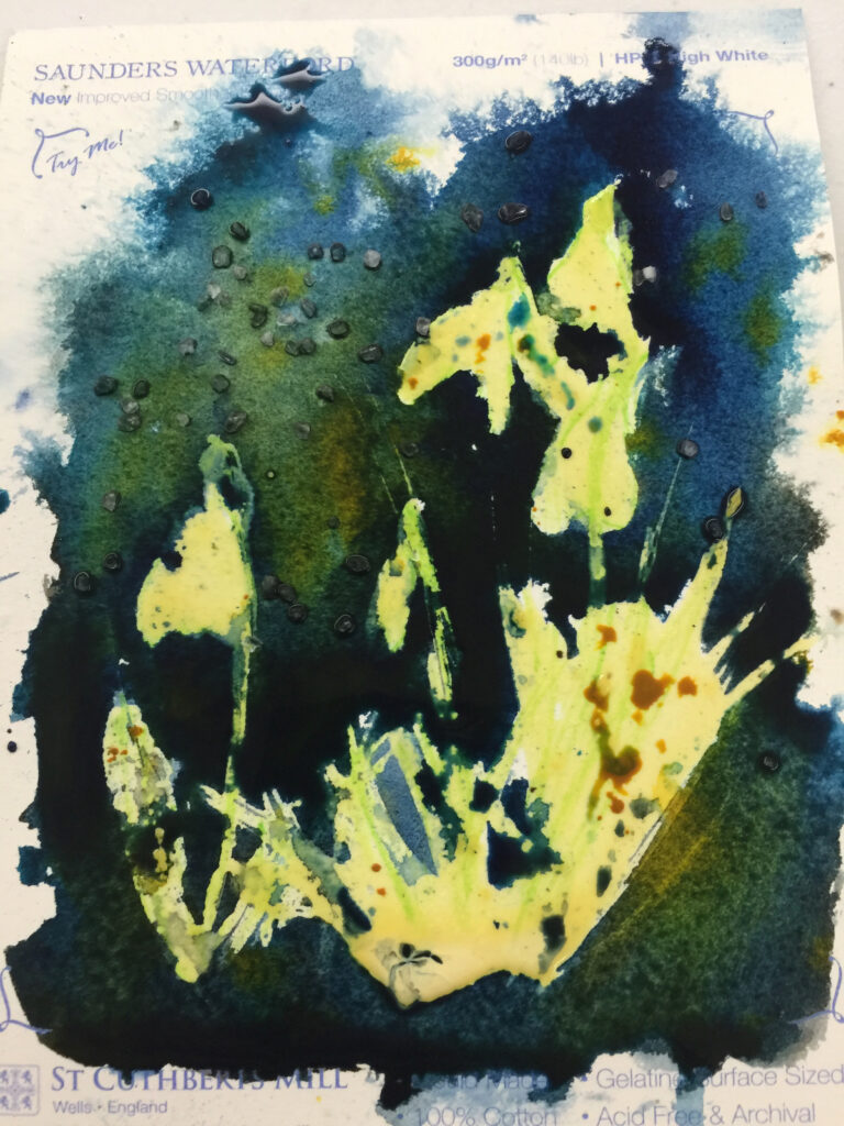 Apply masking fluid to the flowers and leaves so you can paint with abandon when you’re getting the background done. There is nothing worse than thinking you’ll remember to be careful around the areas you want to preserve as white – and then having an ‘Oops’ moment as you realise you’ve just obliterated a snowdrop. Also, my masking fluid was somewhat elderly which made things a bit challenging. [Tip: don’t do this. Lumpy masking fluid is just horrible to work with].