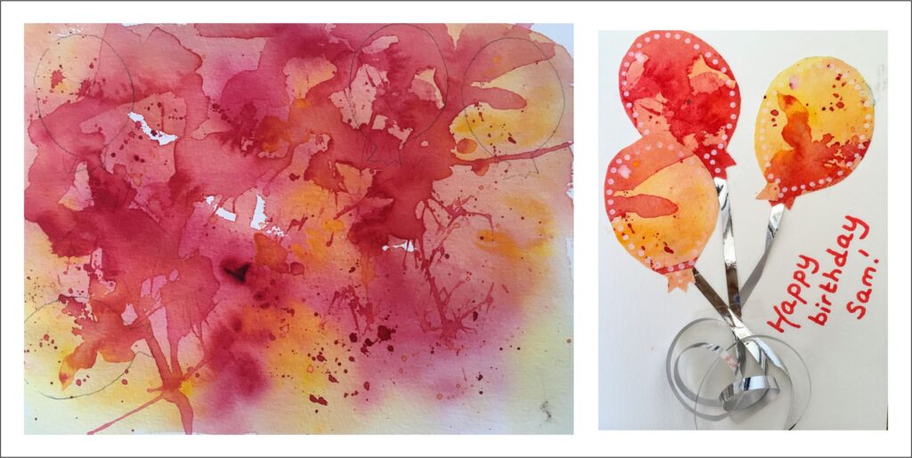 Here, various mixes of red and yellow watercolours were added to dry paper, allowed to dry and the process repeated. This allowed a mix of hard and soft edges. Simple balloon shapes were cut out and stuck onto the folded card, a white acrylic posca pen added dots for detail, and finally, wrapping ribbon was added to make the strings of the balloons.