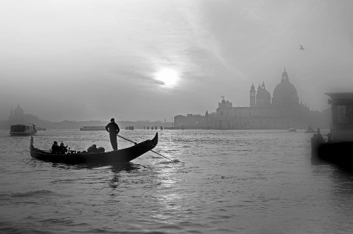 A photograph is rarely a perfect composition so you can use your artistic license to rearrange elements and improve the composition. I altered elements in the photograph so that it roughly follows the “rule of thirds”. The main buildings are moved to the left, so the large dome falls on the right vertical third. I moved the gondola down to fall in line with the bottom third and moved the sun, so it falls on the left third.
