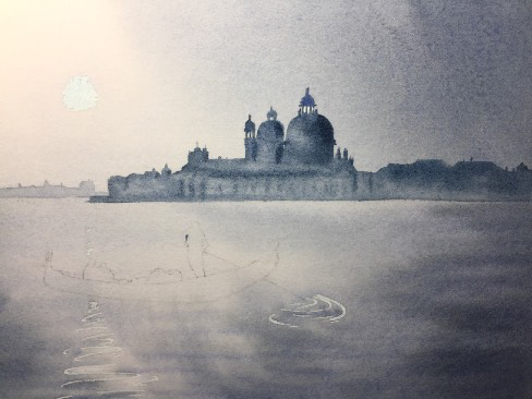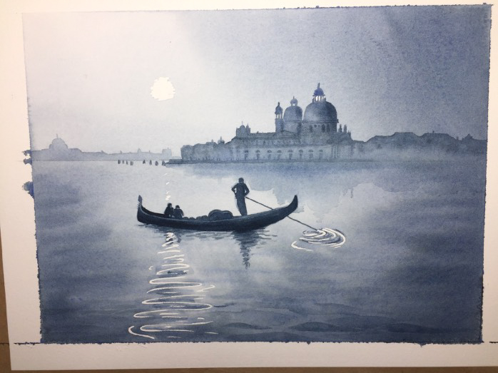 The last areas to paint are the fine details on the gondola using a stronger mix applied with the pointed brush. A few darker ripples were added in the foreground to the water.