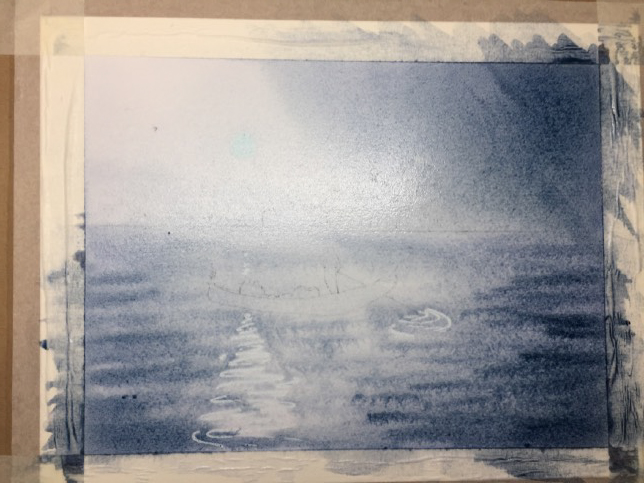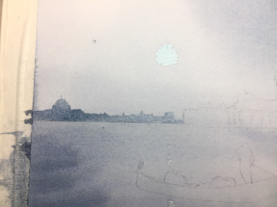 The wash must be completely dry before moving to the next stage or the colours for the buildings will bleed into the sky and water.
