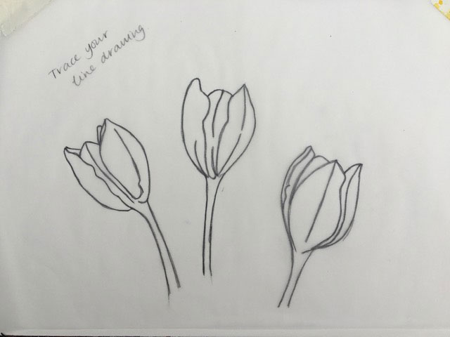 Use flowers from life or good quality photos, I usually use both as reference. Flowers have a habit of moving or decaying, and the photographs are an essential aid if you are going to be working on a piece for some time. Draw the basic outline shapes of the tulips onto your cartridge/drawing paper. It is better to do this rather than draw directly onto your watercolour paper, as we want to preserve a nice clean surface without too much rubbing out, which will damage the paper!