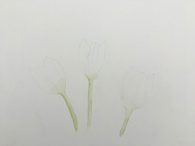 Return to the now dry stems, and add more colour, usually to one side of the stem to show where the light is coming from and create form. Use the same green mix, just a little less water. Then return to the flowers in the same way, building up colour where you observe the darker areas on the flowers. In this example, I have allowed a little of the green stem mix to run up into the base of the petals, as they are not completely white here.