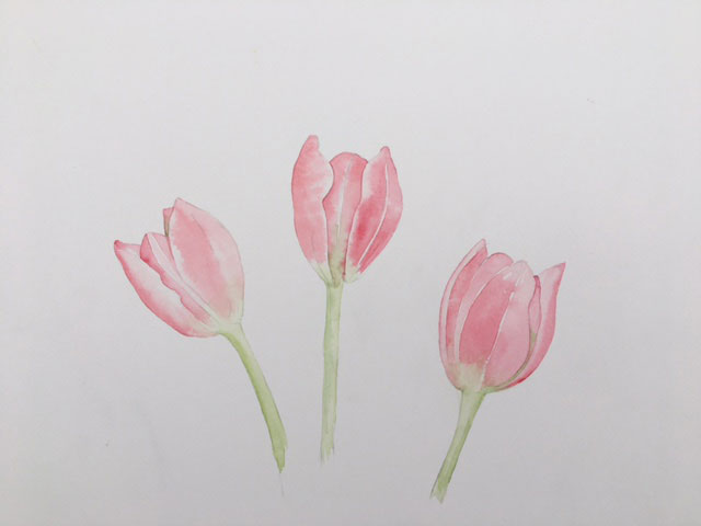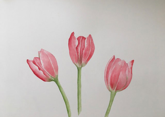 Remember to leave the white/light edges to the petals to give the tulips their shape. I have added a little more detail with stronger colour at the base of the petals where they meet the stem, again to create some shadow and achieve a more realistic look. Use quite a dry brush at this stage, not too much water, and the very tip of your brush. You can go on building colour if you like, in the darker areas, to add more shape and detail, you can add a darker green mix to where the shadows fall on the stems. (I added a little Cobalt Blue for the shadow mix) You can also use the white gouache to enhance any highlights you may have lost. The final image shows the flowers at different stages of development, the flower on left in the final image having been completed.