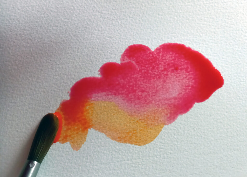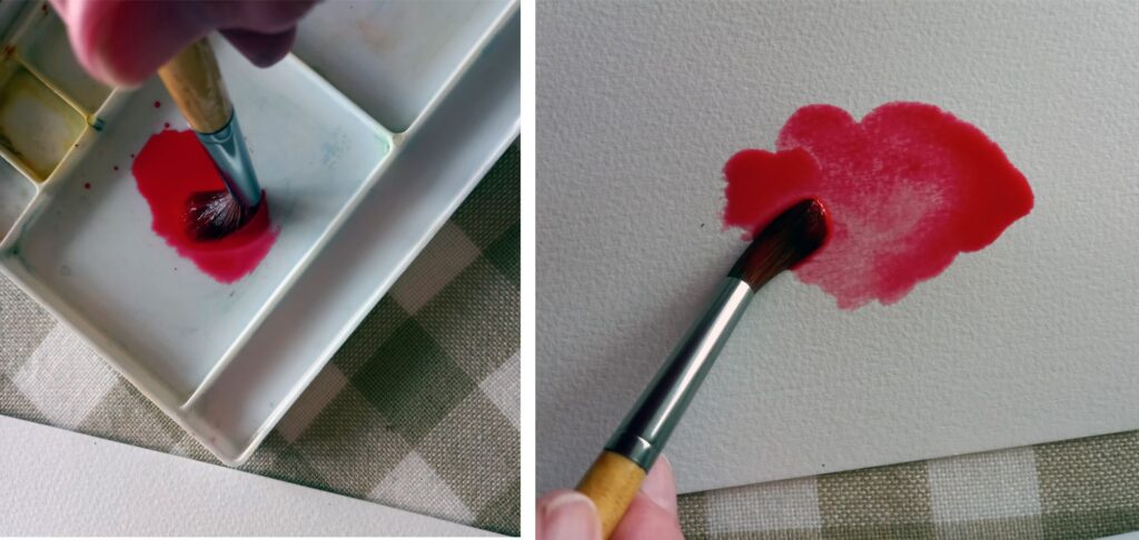 The well of the brush is near the ferule (the metal area which holds the hairs/bristles), you need to immerse the well fully into your puddle of paint. Knock excess off the tip, and press your brush onto the paper – this will release a flow of paint which will cover a large area without requiring a lot of brush marks. Using only the tip of your brush, which will only hold a teeny amount of paint, will result in ‘lines’.