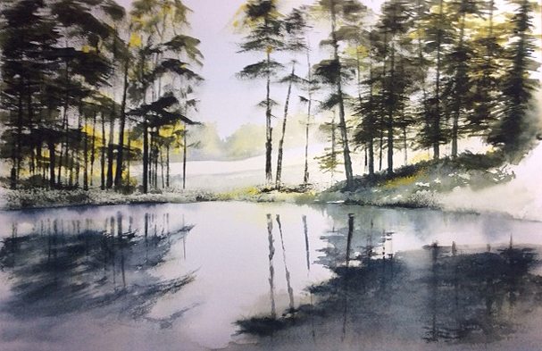 The next step is to establish the darkest dark and for this I used some of the tree trunks and a mix of Quinacradone Gold and Ultramarine Blue giving a nice range of dark greens. In this piece I stamped all the tree trunks and foliage using a piece of corrugated cardboard dipped in the appropriate paint – a bit unorthodox perhaps but it worked. With all the trees thoroughly dry I wetted the pond area with clean water and introduced the first soft reflections, dropping thin washes into the wet paper and letting them bloom, tilting the board to encourage these washes into the right places.