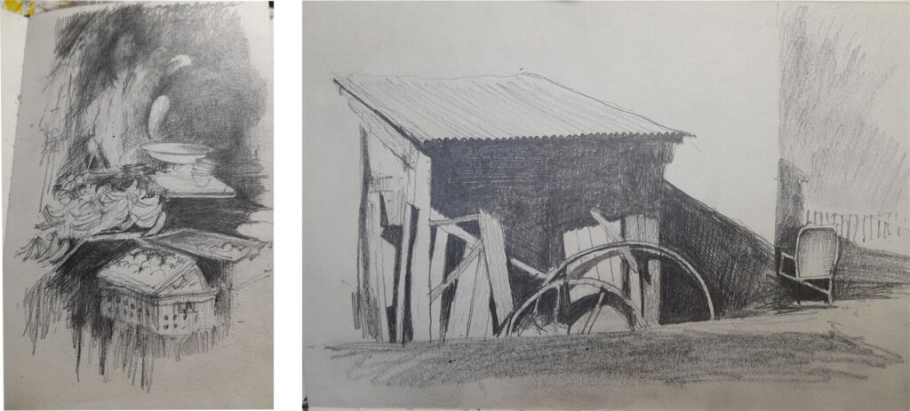 The sketch above left, is one I made of a market stall. In reality it is full of colour – bananas – apples and I think the lady in the background had on a dull green coat but this tonal sketch shows me where my darkest darks need to be, thereby emphasising the light. These sketches are also useful in composing your work and experimenting with the location of hard and soft edges. All these elements combine to provide impact and movement in your painting and make it the one to be noticed across a crowded room. The sketch above right, shows how darks can emphasise hard edges which give the impression of strong, bright light.