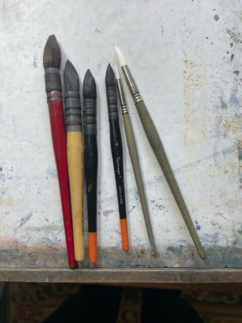 If you want to paint big paintings then it is very important to use big Mop brushes. To cover a larger area one needs larger mop brushes to paint quickly. One sees some painters using small brushes for large areas of painting. I do not think it ever works. Be bold and paint with a larger brush and your painting will improve. For detail use small brushes. I use synthetic brushes from Escoda for detail. Rosemary&Co has an excellent selection of brushes.
