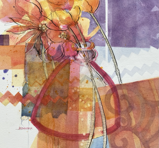 I have developed a passion for pots over the years and can never resist an evocative shape in a charity shop window, and in particular those that are hand built or hand thrown and showing signs of pressure marks. I turn them into my own by adding decoration and altering the colour at will. This particular pot has appeared in several recent paintings, although sometimes it is upside down! It is of no consequence really – it is whatever works in the moment. I look at the creation of my still life paintings rather like writing a novel – a work of fiction. The objects do exist, but are not photographically rendered – the colours are totally invented and the composition is imaginary.