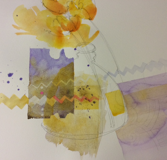 The abstracted floral content just adds a splash, but I am mainly focusing on the rectangular shapes to which I have added coloured designs to enable the eye to take a journey around the surface of the paper.