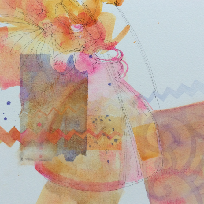 I am more interested in this instance in creating patterns, both organic and geometric, and having commenced with a very simple curvaceous linear drawing, in fact the strong colours in pure watercolour built in delicate glazes, had taken centre stage.