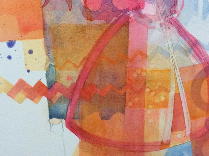 At intervals I have lifted off various decorative shapes with a magic sponge, with the aid of an acetate sheet cut with my own zig-zag design, and again at times applied yet another layer of wash to push back the white areas just revealed. Another flat brush is less than 1cm wide, and enables me to apply the watercolour in quite graphic lines and curves – again usually with more than one colour, building up a delicate depth of colour. Other brushes used were my large wash brush (filbert), and a medium round wash with a good long point – all brushes are squirrel hair. I am constantly moving around the painting as it progresses, photographing it with my iPad at intervals to evaluate it, and I continue to balance each area as I go, getting braver with each stroke! With constant evaluation I can keep an eye on the possible outcomes, at the same time enabling myself to take risks, but am also aware that at some stage ‘enough will be enough’.